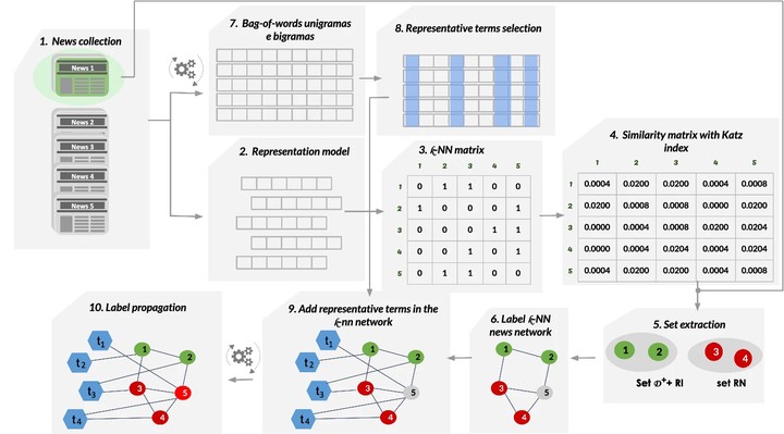 FFake news can rapidly spread through internet users and can deceive a large audience. Due to those characteristics, they can have a direct impact on political and economic events. Machine Learning approaches have been used to assist fake news identification. However, since the spectrum of real news is broad, hard to characterize, and expensive to label data due to the high update frequency, One-Class Learning (OCL) and Positive and Unlabeled Learning (PUL) emerge as an interesting approach for content-based fake news detection using a smaller set of labeled data than traditional machine learning techniques. In particular, network-based approaches are adequate for fake news detection since they allow incorporating information from different aspects of a publication to the problem modeling. In this paper, we propose a network-based approach based on Positive and Unlabeled Learning by Label Propagation (PU-LP), a one-class and transductive semi-supervised learning algorithm that performs classification by first identifying potential interest and non-interest documents into unlabeled data and then propagating labels to classify the remaining unlabeled documents. A label propagation approach is then employed to classify the remaining unlabeled documents. We assessed the performance of our proposal considering homogeneous (only documents) and heterogeneous (documents and terms) networks. Our comparative analysis considered four OCL algorithms extensively employed in One-Class text classification (k-Means, k-Nearest Neighbors Density-based, One-Class Support Vector Machine, and Dense Autoencoder), and another traditional PUL algorithm (Rocchio Support Vector Machine). The algorithms were evaluated in three news collections, considering balanced and extremely unbalanced scenarios. We used Bag-of-Words and Doc2Vec models to transform news into structured data. Results indicated that PU-LP approaches are more stable and achieve better results than other PUL and OCL approaches in most scenarios, performing similarly to semi-supervised binary algorithms. Also, the inclusion of terms in the news network activate better results, especially when news are distributed in the feature space considering veracity and subject. News representation using the Doc2Vec achieved better results than the Bag-of-Words model for both algorithms based on vector-space model and document similarity network.