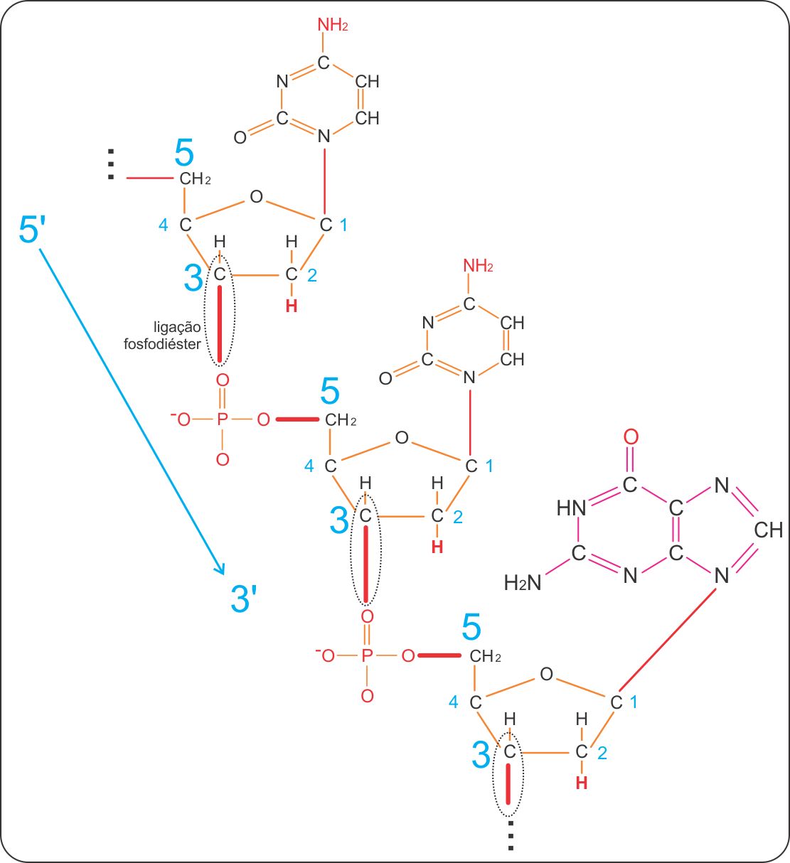 Como dito anteriormente, os nucleotídeos são formados por três diferentes tipos de moléculas (uma desoxirribose, um grupo fosfato e uma base nitrogenada). A orientação das ligações entre as três moléculas constituintes dos nucleotídeos é essencial para se determinar o sentido da fita de DNA. A ligação entre a base e a pentose é feita covalentemente através de uma ligação N-glicosídica com a hidroxila ligada ao C1' da pentose. Já a ligação entre o fosfato e a pentose é feita através de uma ligação fosfodiéster com a hidroxila ligada ao C5' da pentose. Veja a Figura 4.