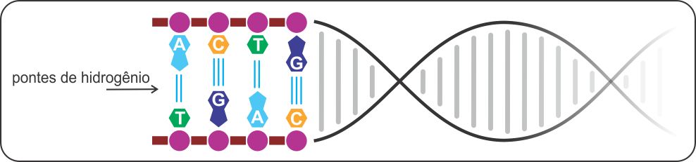 A molécula de DNA é uma dupla hélice cujas cadeias estão unidas por pontes de hidrogênios estabelecidas entre purinas e pirimidinas das fitas opostas. Adenina sempre pareia com timina (A--T) e guanina com citosina(G--C). Veja a Figura 5.