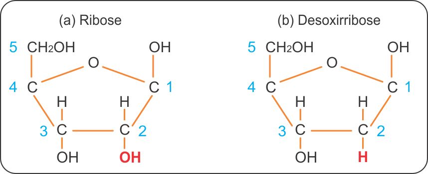 Dois tipos de pentoses (resíduos de açúcar) são encontrados nos ácidos nucléicos: ribose e desoxirribose as quais diferem uma da outra pela presença ou ausência do grupo hidroxila no carbono 2 (C2') da pentose, Figura 3. É baseado nesta característica, dentre outras, que os ácidos nucléicos recebem o nome de RNA (ribose) ou DNA (desoxirribose). O ácido ribonucleico (RNA) é um polímero de nucleotídeos, assim como o DNA, responsável pela síntese de proteínas da célula. Porém, geralmente é encontrado em cadeia simples e possui dimensão muito inferior que o DNA. Este trabalho enfoca a replicação de DNA, assim, o conceito de RNA não será mais abordado.