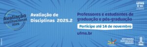 A Avaliação Institucional 2025/2 está aberta para receber as contribuições da comunidade universitária para melhoria contínua da UFMS.  O preenchimento é anônimo, voluntário e deve ser feito no Sistema de Avaliação Institucional, com login e senha do Passaporte UFMS,  conforme cronograma estabelecido. A avaliação das disciplinas referente a 2025/2 está aberta até dia 14/11/2025.