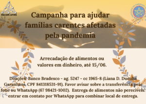 A FACOM se uniu a uma campanha do Instituto da Caridade Universal (www.facebook.com/icubrasil) para ajudar famílias carentes de Campo Grande afetadas pela pandemia.  Após a arrecadação de alimentos ou doações em dinheiro, montaremos e entregaremos cestas básicas a estas famílias.