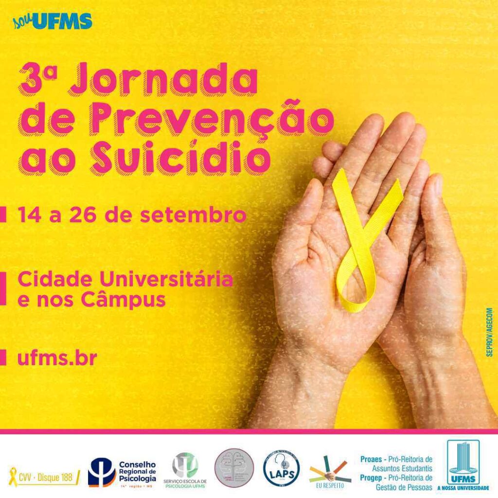 O mês de setembro é dedicado à campanha de prevenção do suicídio. Em nossa instituição será realizada a III Jornada de Prevenção ao Suicídio da UFMS: promovendo acolhimento em tempos de pandemia, com atividades de 14 à 26 de setembro. A abertura será transmitida on-line no dia 14, em canal ainda a ser informado. Outras atividades serão realizadas de acordo com programação local, que pode ser encontrada neste link. Já as inscrições para participação nas atividades locais podem ser realizadas aqui.