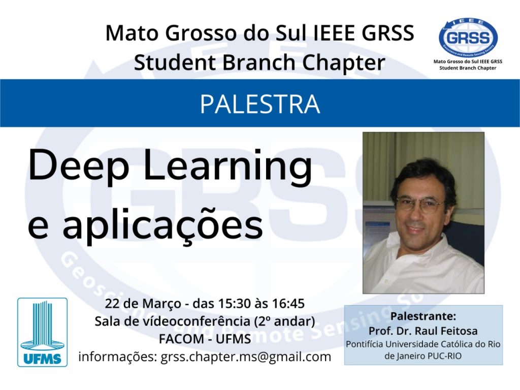 O Capítulo Estudantil Mato Grosso do Sul IEEE GRSS 🌎 convida a todos para a palestra “Deep Learning e aplicações” que será realizada pelo Prof. Dr. Raul Queiroz Feitosa da PUC-Rio e UERJ.