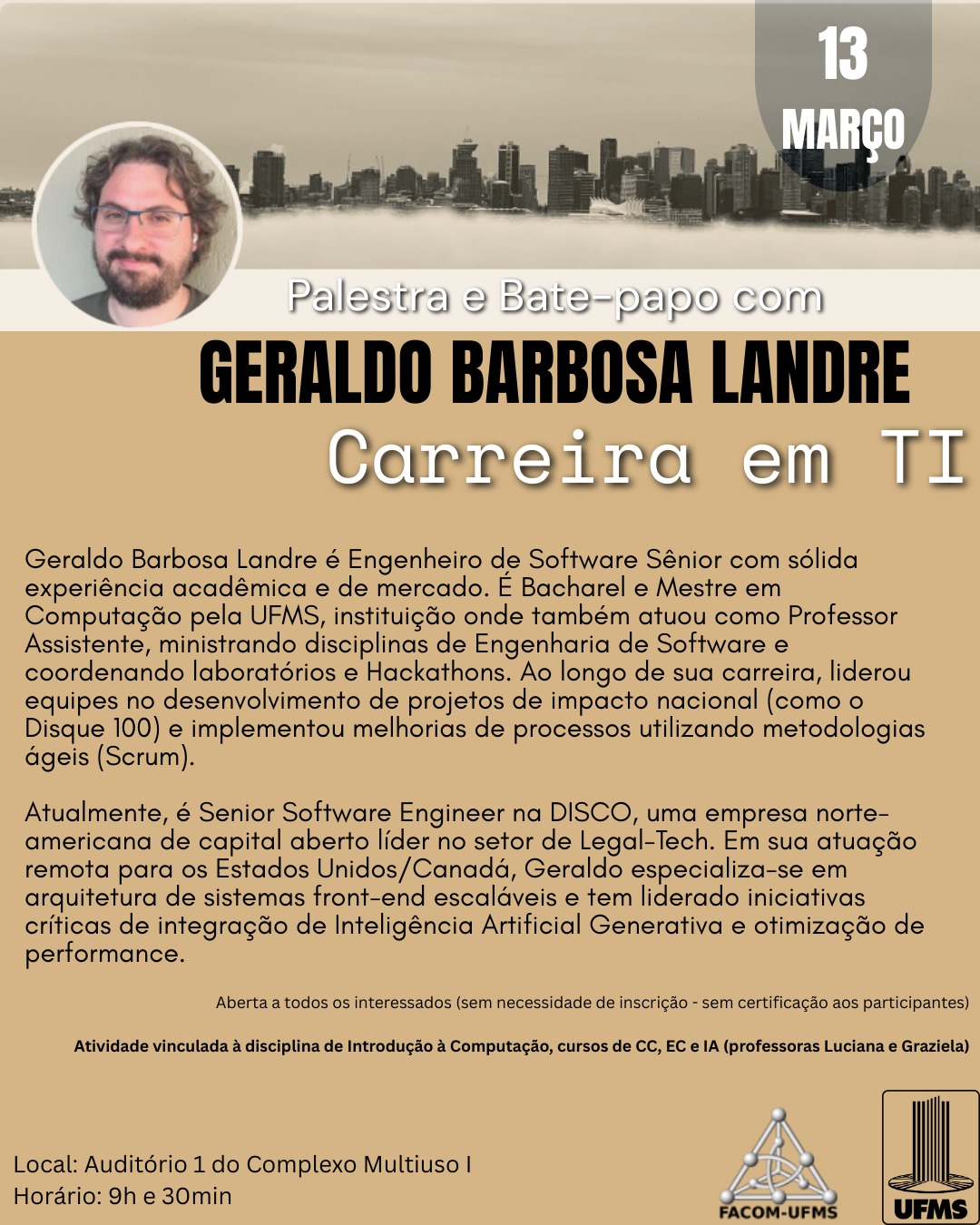 A palestra será sobre a Carreira de TI no dia 13/03 às 9:30 no Auditório 1 do Complexo Multiuso 1.