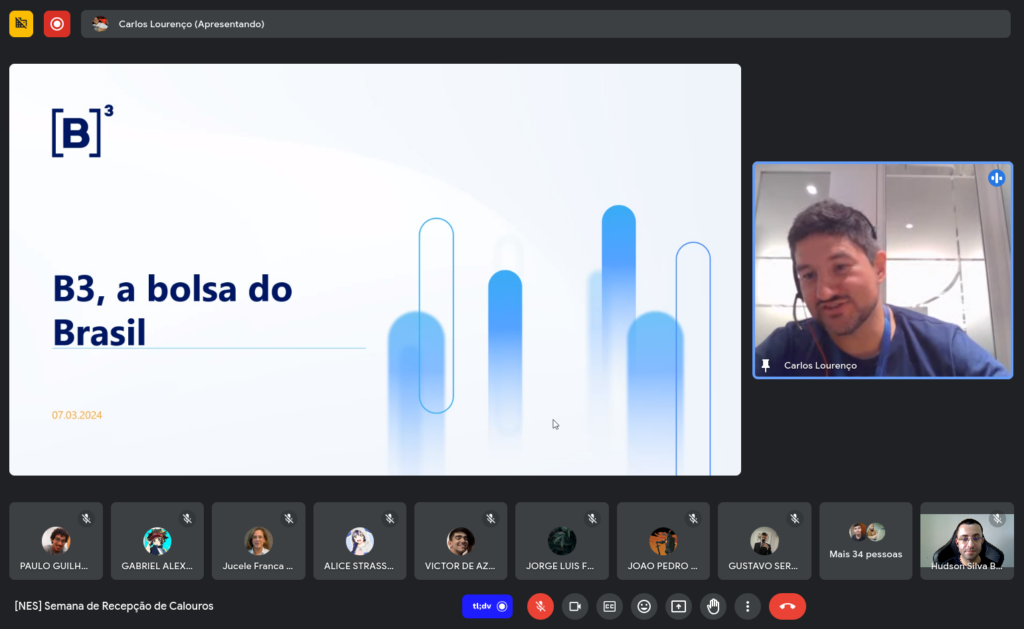 No dia 07/03/2024, os alunos do NES (Núcleo de Práticas em Engenharia de Software) e da FACOM/UFMS tiveram o privilégio de desfrutar de uma palestra virtual enriquecedora com Carlos Lourenço, coordenador de Engenharia de Infraestrutura na B3, com intermédio da plataforma Empower. Foi uma oportunidade única de mergulhar no universo tecnológico por trás das finanças, carreira e oportunidades oferecidas em uma das principais empresas de infraestrutura de mercado financeiro do mundo.