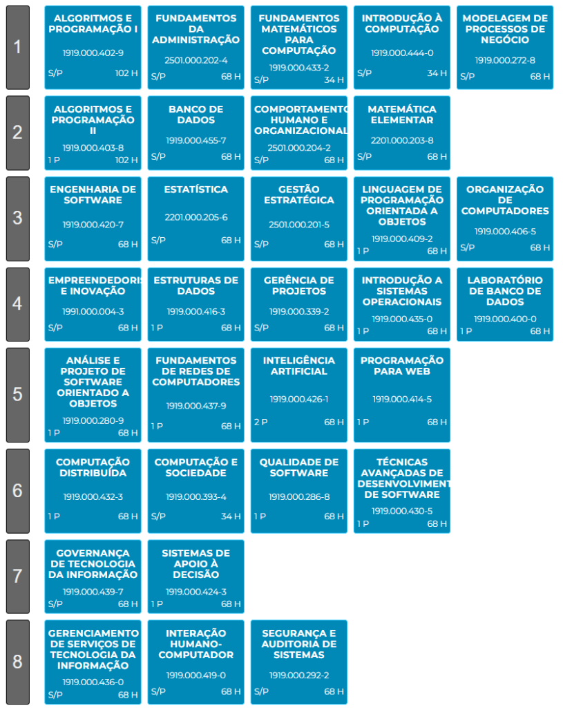 O curso de Sistemas de Informação da UFMS é estruturado em oito semestres, com disciplinas organizadas em quatro eixos formativos: básico, tecnológico, humanístico e complementar.