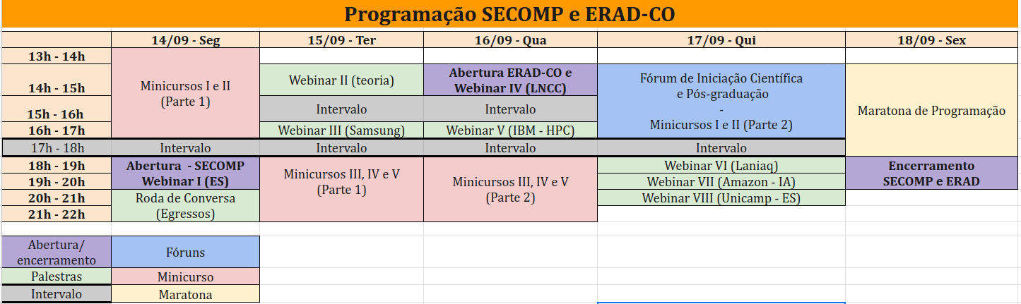 | Palestras | Desafio de programação | Minicursos | Roda de conversa | Fórum de pós-graduação |