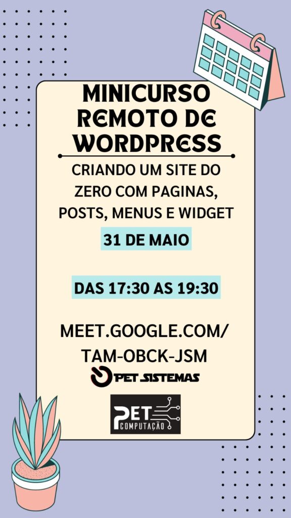 Olá estudantes, o PET Computação e o PET Sistemas da Facom estão oferecendo um minicurso remoto de 2 horas sobre WordPress na prática. Nesse curso você aprenderá como criar e gerenciar sites utilizando a plataforma WordPress, com temas personalizáveis e plugins para aprimorar a funcionalidade do seu site.