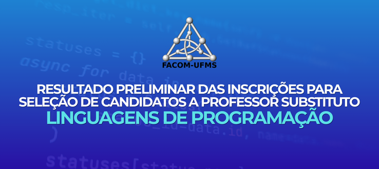 Publicado o Edital EDITAL N° 6 – FACOM/UFMS, DE 24 DE FEVEREIRO DE 2026., que torna pública o resultado preliminar das Inscrições para seleção de candidatos a professor substituto – Linguagens de Programação.