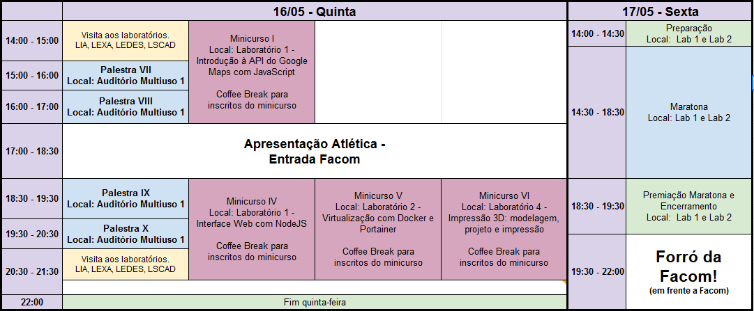 Para fechar a semana cheia de minicursos e palestras, na sexta-feira (17/05), vai rolar um arrasta-pé aqui mesmo na entrada da Faculdade de Computação, das 19:30-22:00 horas.