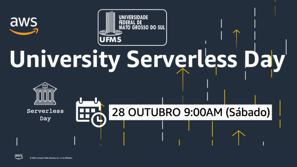 A Amazon Web Services (AWS) realizará o evento University Serverless Day na FACOM/UFMS no dia 28 de outubro de 2023. O evento proporcionará um treinamento PRESENCIAL de um dia inteiro sobre as plataformas e ferramentas Serverless da AWS, oferecido por profissionais da empresa, e será realizado no Anfiteatro 1 da Unidade Multiuso. O evento é gratuito e aberto a todos os estudantes de graduação e pós-graduação da área de Computação e Tecnologia da UFMS (da Cidade Universitária e dos câmpus do interior, dos cursos presenciais e a distância) e também a todos os profissionais de TI da UFMS. A inscrição deve ser realizada pelo Sympla, no link informado abaixo.