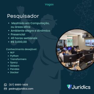 Somos uma startup que desenvolve soluções de IA para a área jurídica. Estamos buscando pesquisadores para atuarem no desenvolvimento de um novo produto inovador que tem fortes pilares no entendimento e no agrupamento de textos jurisprudenciais. Esta oportunidade é para você que tem interesse acadêmico-científico e deseja colocar em prática sua pesquisa em um produto para o mercado jurídico.