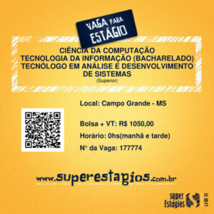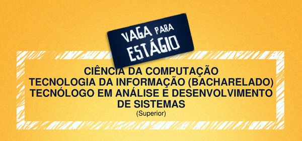 A Super Estágios no intuito de oportunizar vagas de estágios aos estudantes dessa Instituição de Ensino, vem apresentar uma excelente oportunidade de estágios para alunos de curso de (CIÊNCIA DA COMPUTAÇÃO, TECNOLOGIA DA INFORMAÇÃO (BACHARELADO), TECNÓLOGO EM ANÁLISE E DESENVOLVIMENTO DE SISTEMAS).