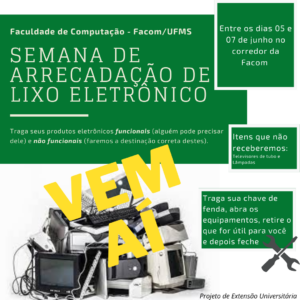 Entre os dias 5 e 7 de julho de 2023 acontecerá a Semana de Arrecadação de Lixo Eletrônico da Facom. Tragam seus equipamentos eletrônicos que não te servem mais. Se eles estiverem em bom estado, podem servir para outra pessoa.
